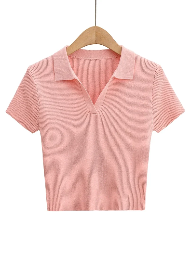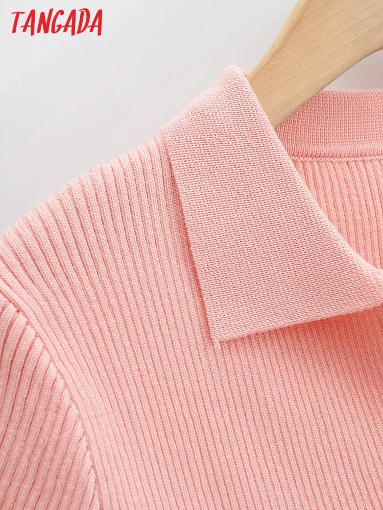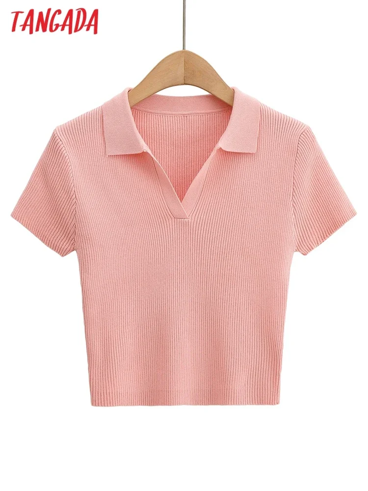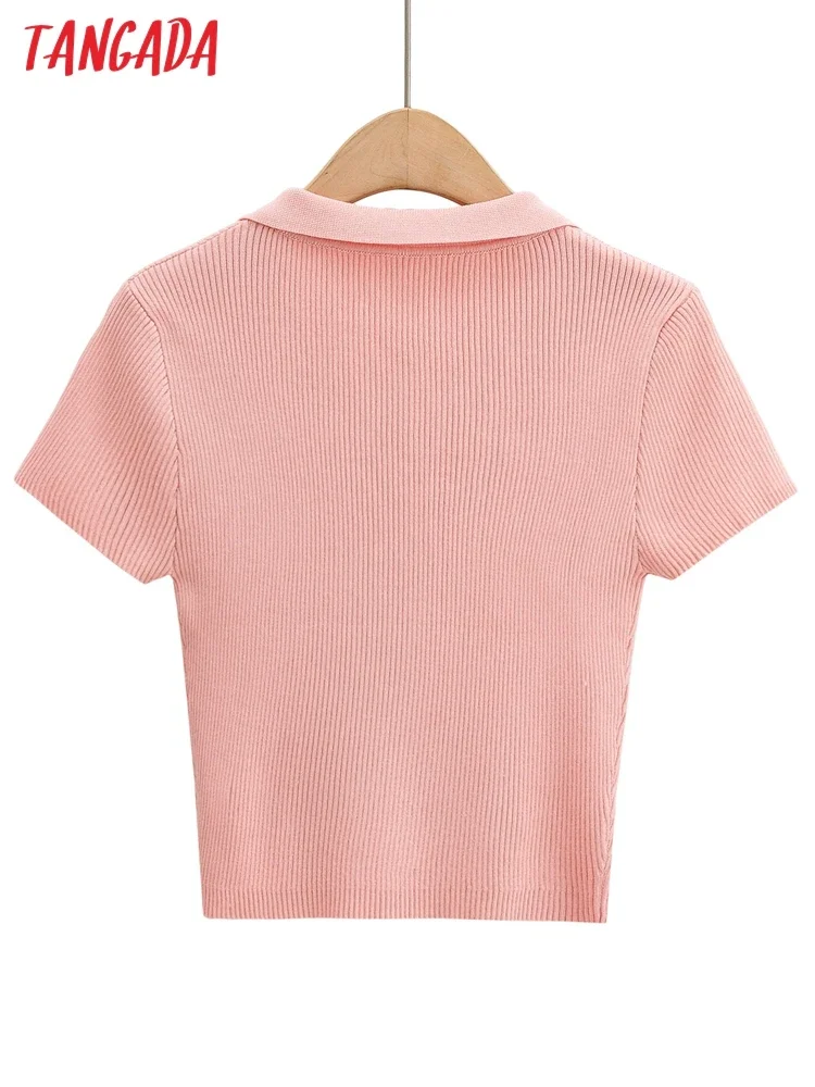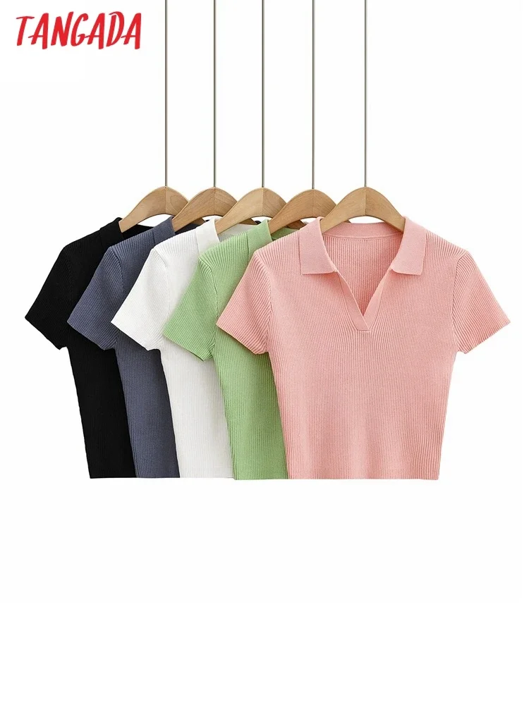 Tangada 2022 여성용 솔리드 크롭 니트 티셔츠, 반팔 턴다운 칼라, 캐주얼 스트릿웨어 상의, 4P124