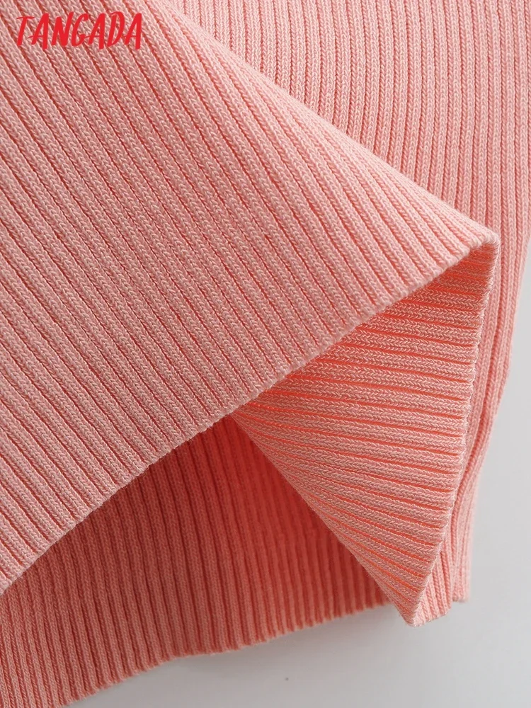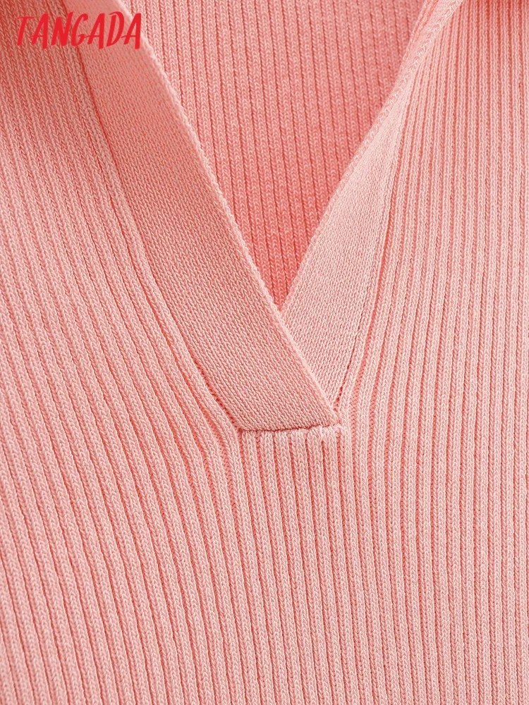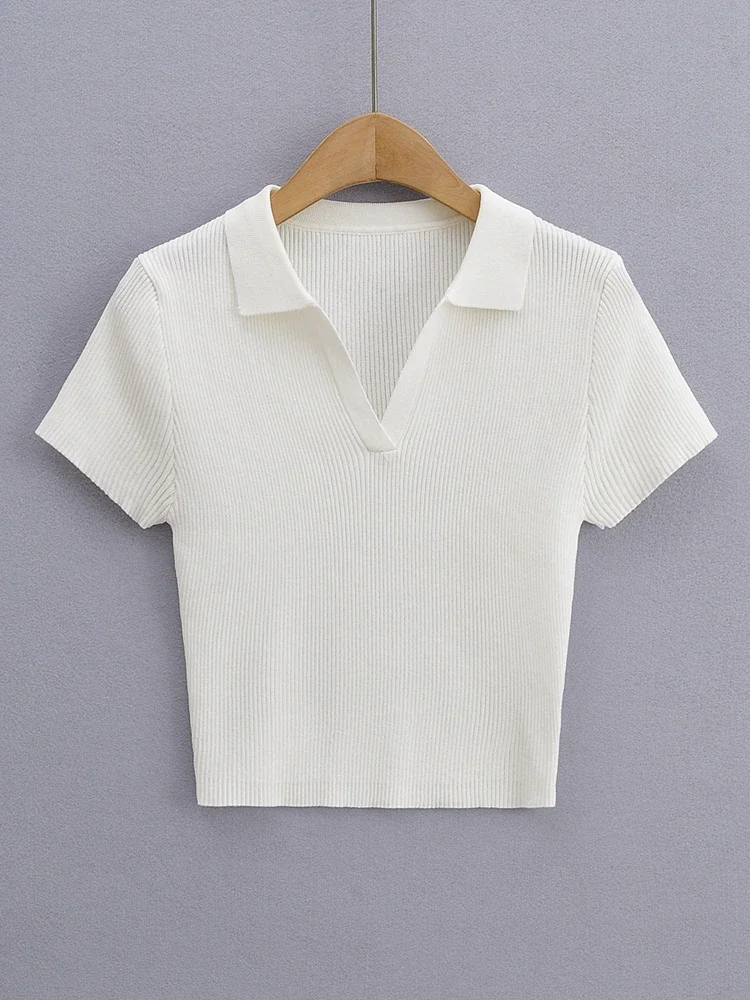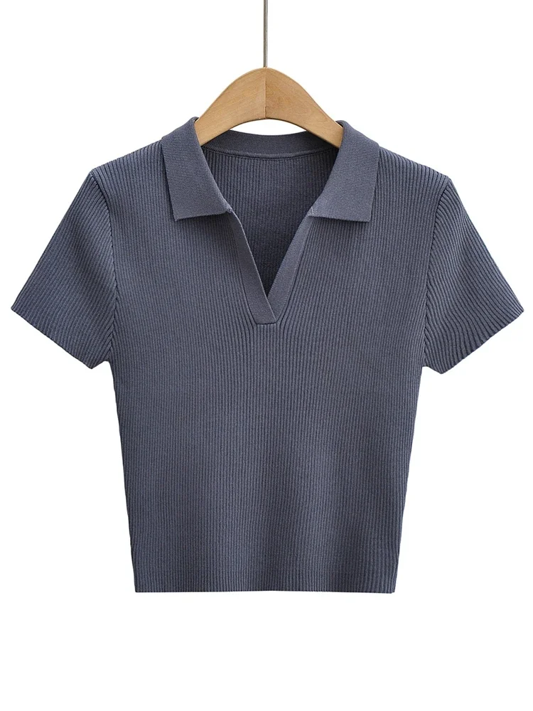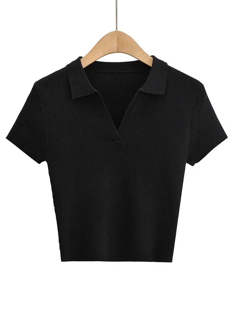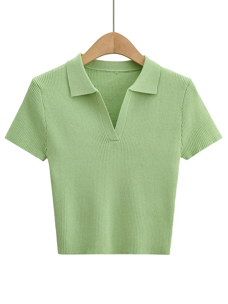 Tangada 2022 여성용 솔리드 크롭 니트 티셔츠, 반팔 턴다운 칼라, 캐주얼 스트릿웨어 상의, 4P124