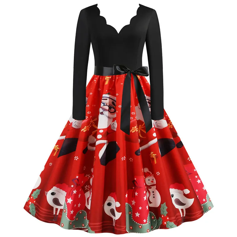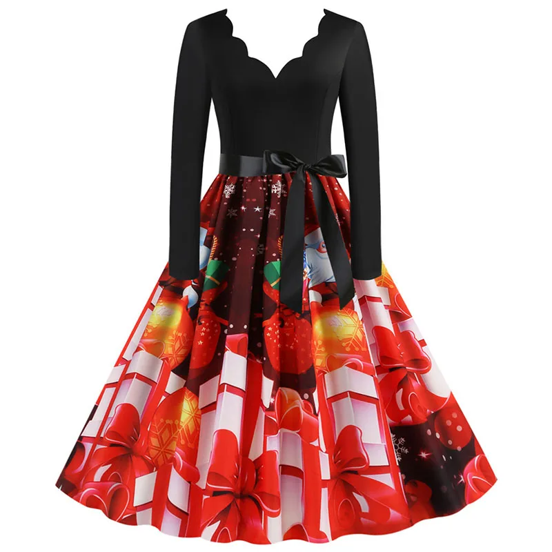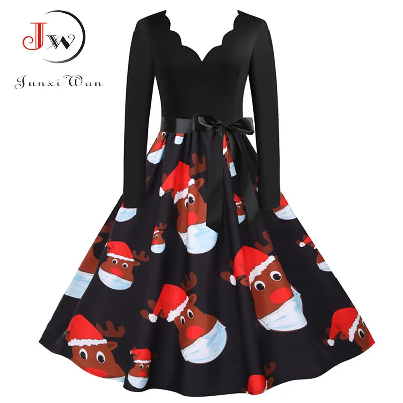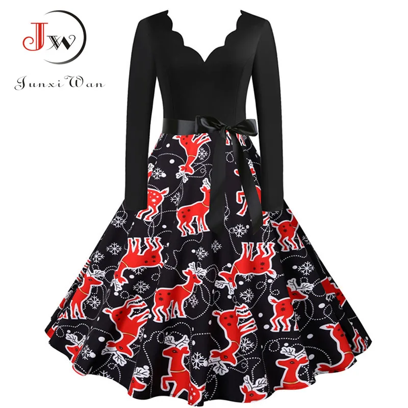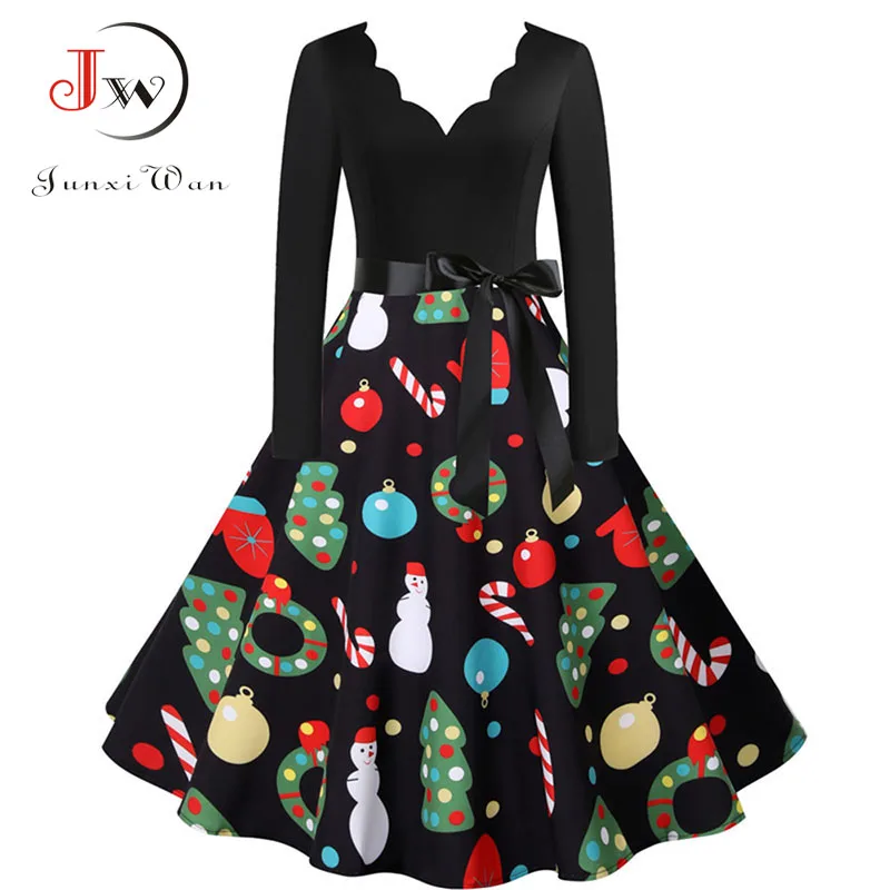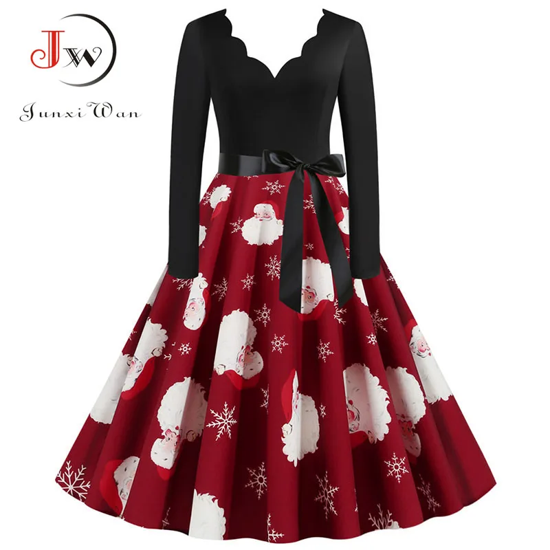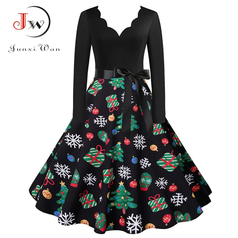 여성 겨울 드레스 긴 소매 V 넥 빈티지 우아한 인쇄 크리스마스 파티 새해 옷, 50s 60S 큰 스윙 섹시한 가운