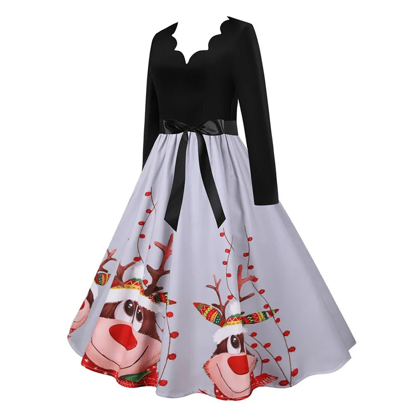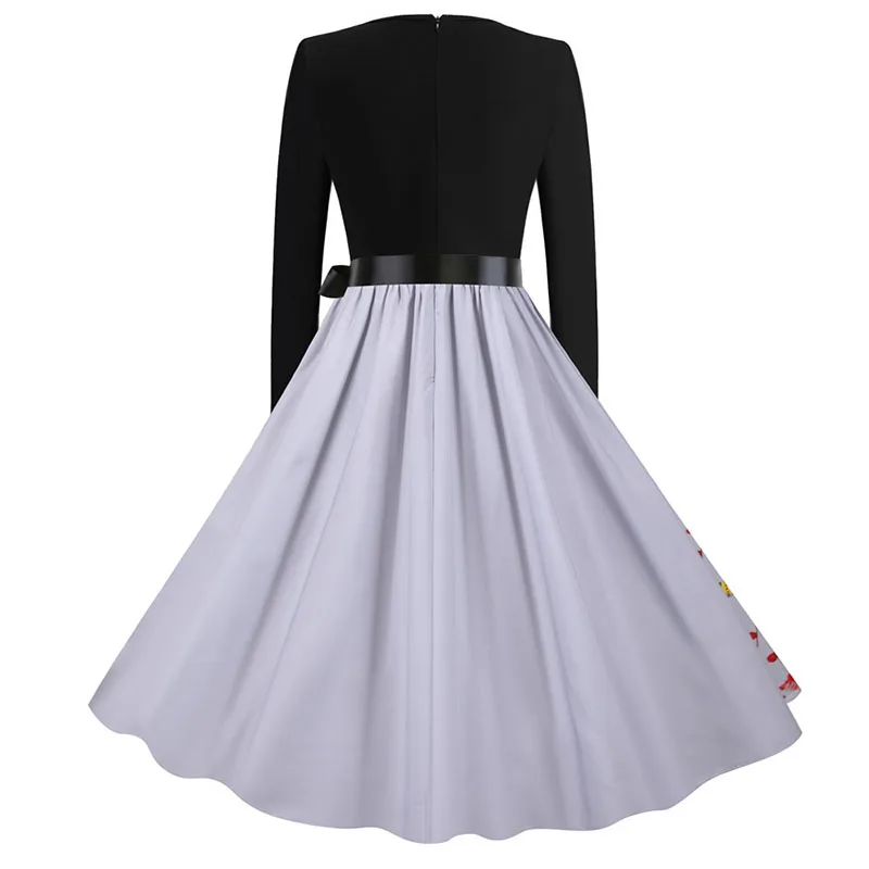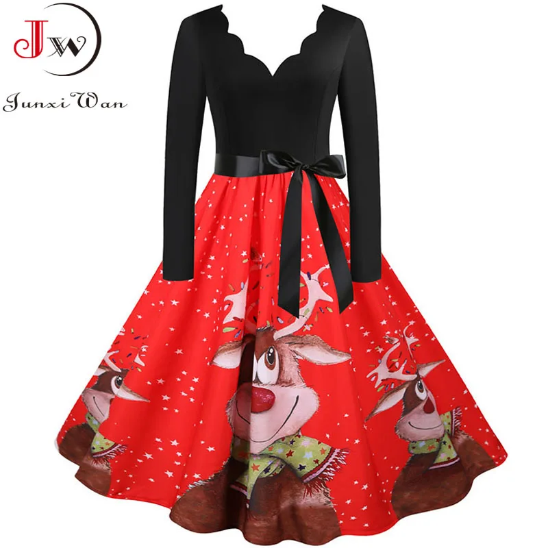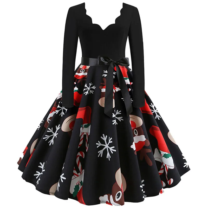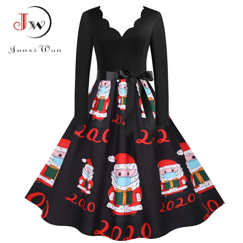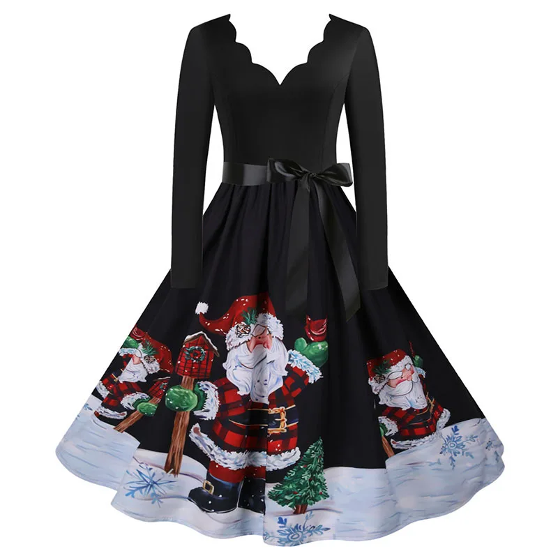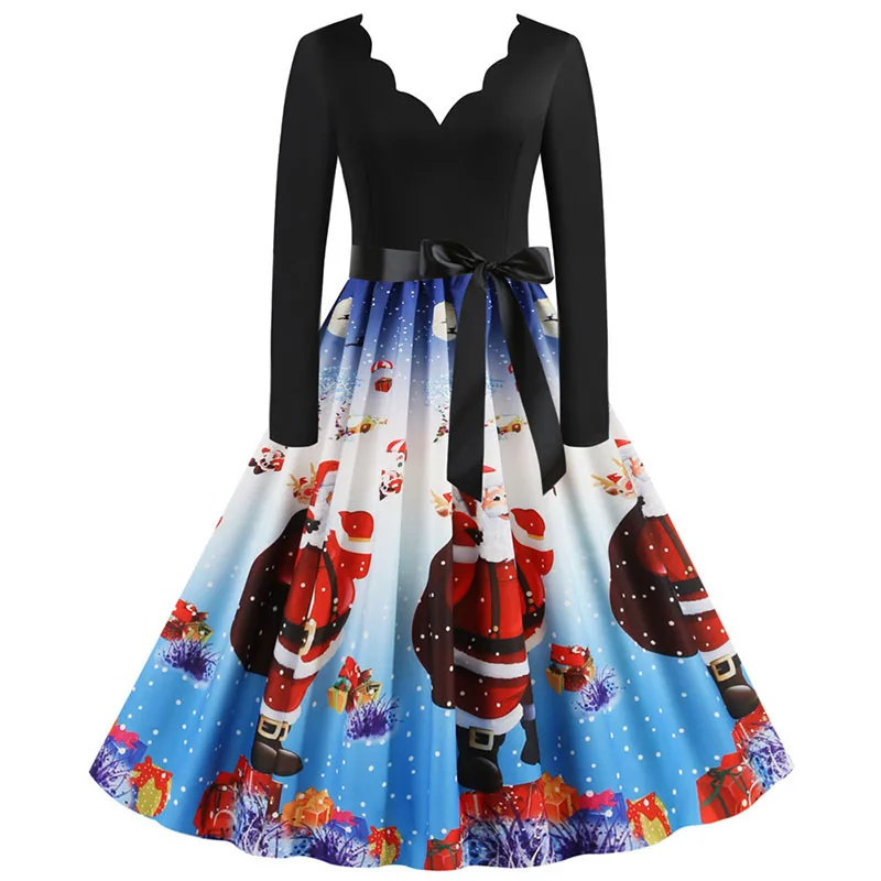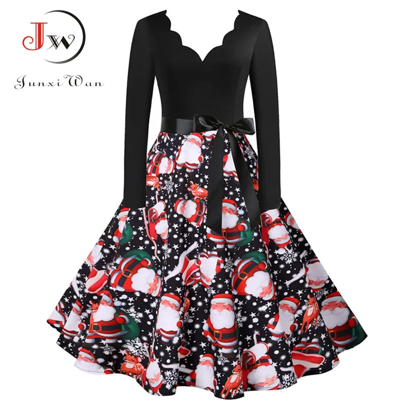 여성 겨울 드레스 긴 소매 V 넥 빈티지 우아한 인쇄 크리스마스 파티 새해 옷, 50s 60S 큰 스윙 섹시한 가운